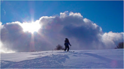 Then, things went downhill very quickly. The clouds came in and wind picked up. It started snowing harder and was blowing at us sideways. She was bare bottomed and now screaming. We use and love cloth diapers, even on the trail, but they can be a bit cumbersome to use, especially in a snow storm. We were getting colder by the second and there was now an inch of fresh snow on our skis. Then, our dog came over and started chewing on the branch that held the coat that was protecting S from the wind and snow. Snow flew all over her. Great. By now, we were all cold and cranky and we decided to pull the plug on the outing. We quickly finished changing her, packed her and everything back up to head home. We got so chilled in that 20 minutes that we decided to continue uphill for 5-10 more minutes just to warm up before heading down. Within 2 minutes, S was fast asleep. Within 5 minutes, the snow stopped. Within 10 minutes, my fingers thawed out, the sun was back out, and we had to take layers off. We were all happy again. So, we continued on. We realized that we stopped during the only 20-minute snow squall of the day, which almost cut our day short. Almost.