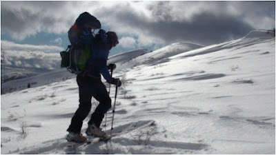 It was a beautiful day for a ski tour, at least at first. We typically like to get an early start, but after figuring out what gear we needed and how to fit it all into the kid carrier (we attached a separate bag), making breakfast and packing lunch, feeding and changing S again, getting the skis ready, and putting her pacifier on belay, we finally headed out at the crack of 11:30. We were familiar with dressing her in the cold: long sleeved Capilene onsie with pants, baby leg warmers to keep her legs warm while changing her outdoors, knitted socks, booties, wool mittens, a thick fleece one piece suit with handwarmers in the hands and feet, a little hat with a felted wool earflap hat over top, sunglasses to protect her eyes and a bit of sunscreen on her exposed face, all under a toasty down outfit. We planned to be outside for up to 5-6 hours and wanted to be prepared for anything. We’d done plenty of cross country skiing and snowshoeing with S on our backs or in her ski trailer, and a little skinning uphill before our local resort opens in the morning. We like to take her on an outside adventure at least 5 days a week. But this was the first backcountry ski tour that I skinned up and skied down with S. I wanted to carry her so I knew I could do it, even though my husband usually carries the heavier backpack. Note: we are both experienced skiers and have excellent backcountry travel skills. We completely avoid avalanche terrain while traveling with S.